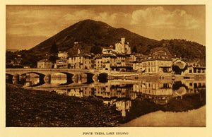 This is an original 1925 sepia Rotogravure of Ponte Tresa in the Lugano district in Switzerland. Seen is Lake Lugano, which borders both Switzerland and Italy. The building on the far right is called, "Caffe Crivelli," based on the sign on its exterior.