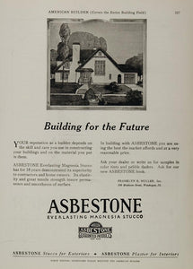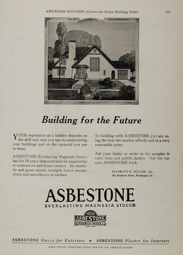 This is an original 1925 black and white print ad for Asbestone Magnesia Stucco, a building material from Franklyn R. Muller, Inc., 208 Madison Street, Waukegan, Illinois. The ad has a nice illustration of a stucco-covered 1920's house.