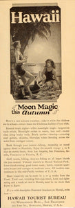This is an original 1925 black and white print ad for autumn travel to Hawaii from the Hawaii Tourist Bureau, 225 Monadnock Bldg., San Francisco.