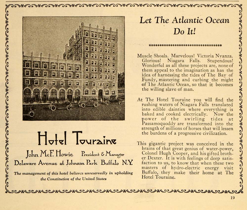 This is an original 1925 black and white print ad for the Hotel Touraine, Delaware Avenue at Johnson Park in Buffalo, NY. John McF. Howie, President & Manager.