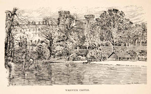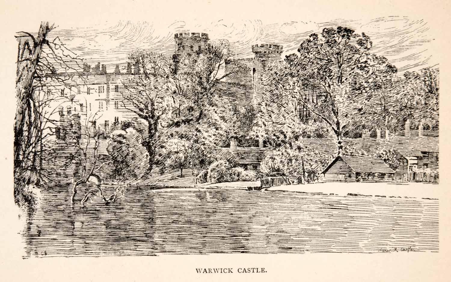 This is an original 1925 black and white wood engraving of Warwick Castle in Warwick, England. The fortress was constructed in 1068 by King William the Conqueror who nicknamed it "The Kingmaker".