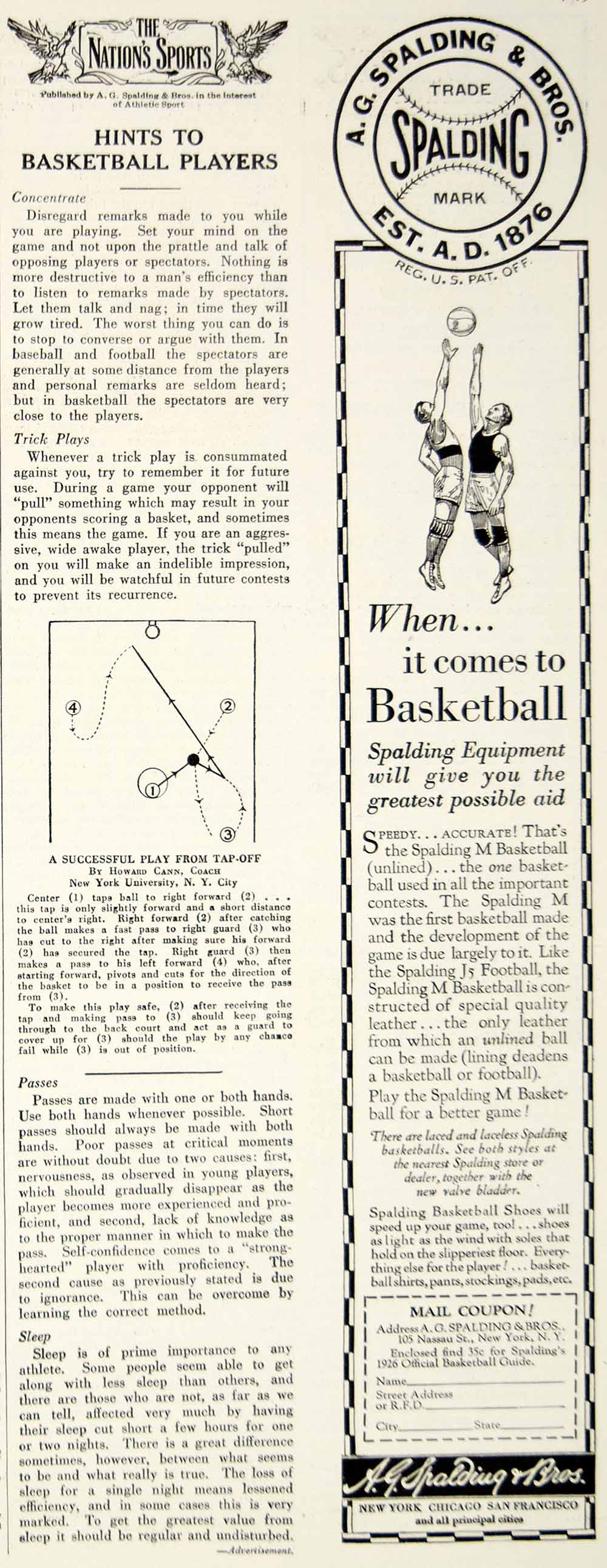 This is an original 1926 black and white print ad for the "M" basketball that was made and sold by A.G. Spalding & Bros. of 105 Nassau Street, New York, NY during the Roaring Twenties era. The ad also features basketball tips.