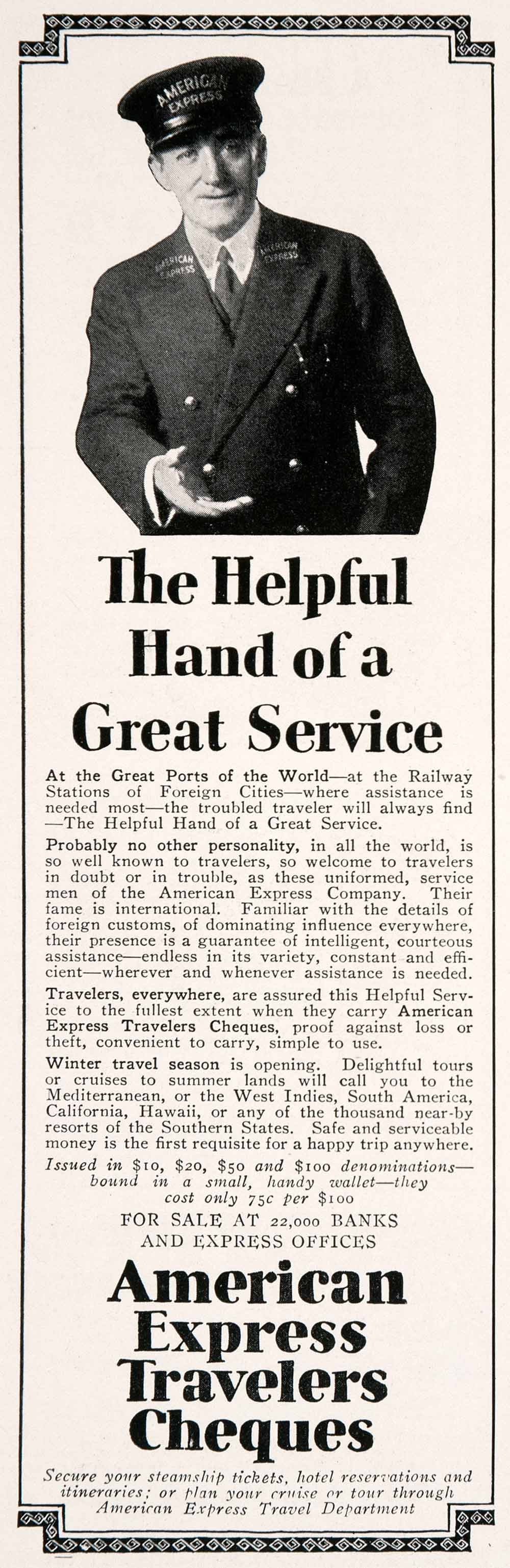 This is an original 1926 black and white print ad for American Express Travelers Cheques.