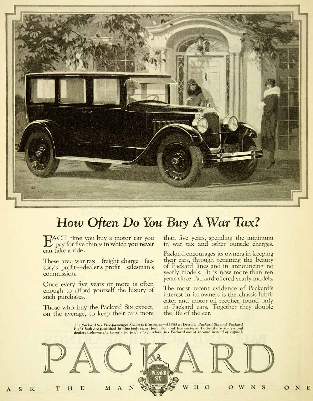 Keywords specific to this image: War Tax Tariff, Pricing, Detroit, American Car Manufacturers, Tagline, Motto, Ask the Man Who Owns One