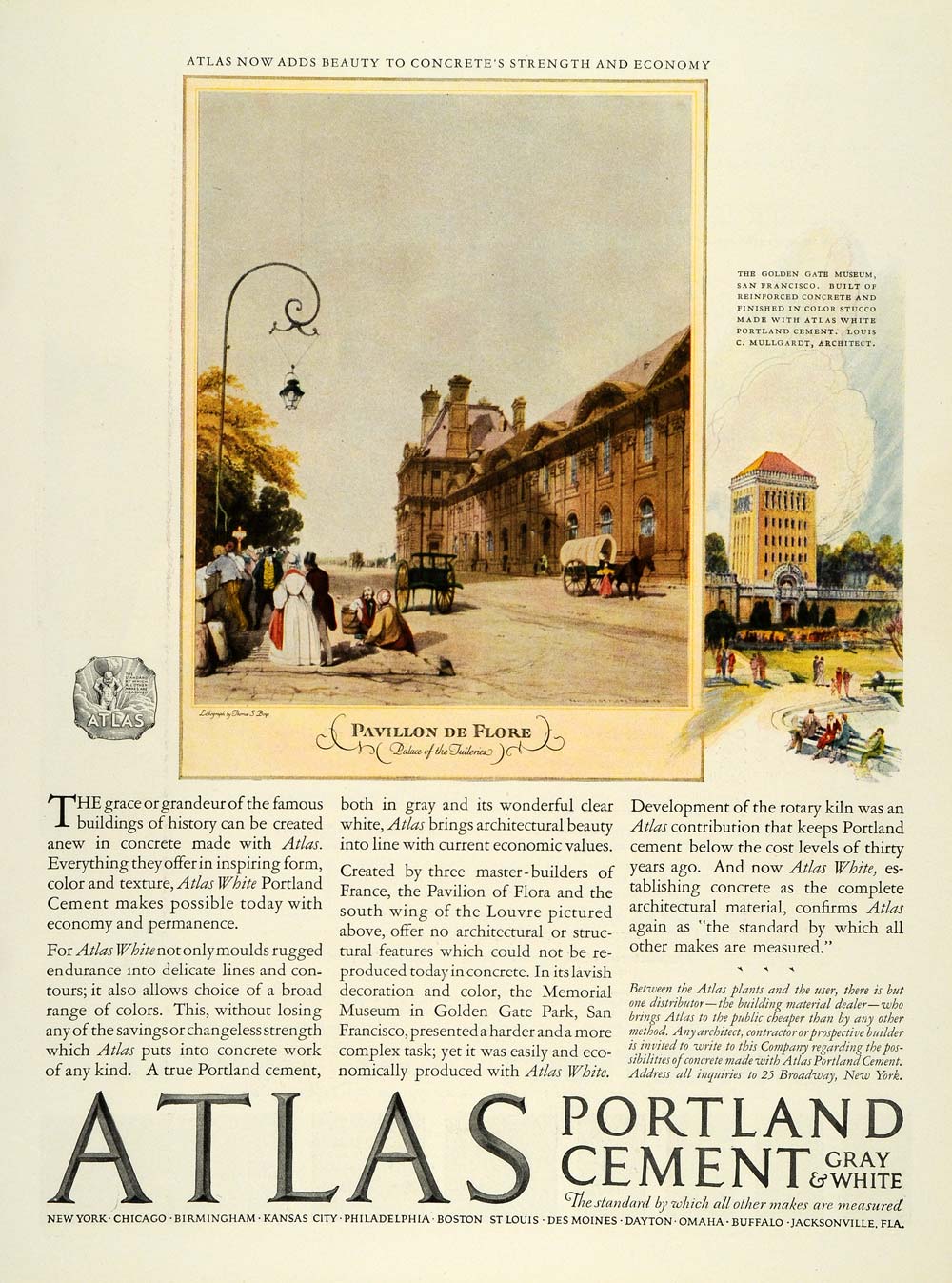 This is an original 1926 color print ad for Atlas Portland Cement, featured on the Golden Gate Museum in San Francisco, California with architecture by Louis C. Mullgardt. This ad is one in a series that compares superior architectural structures pre-Atlas Portland Cement and post-Atlas Portland Cement, in this case the Palace of the Tuileries in France and the Golden Gate Museum in California.