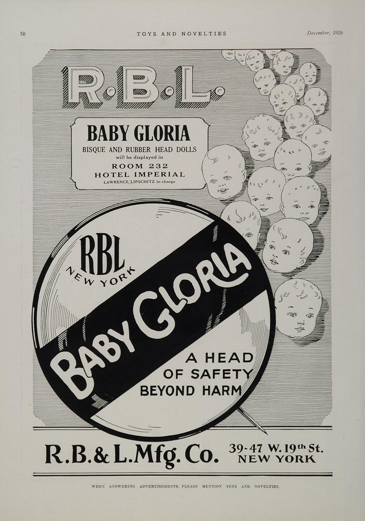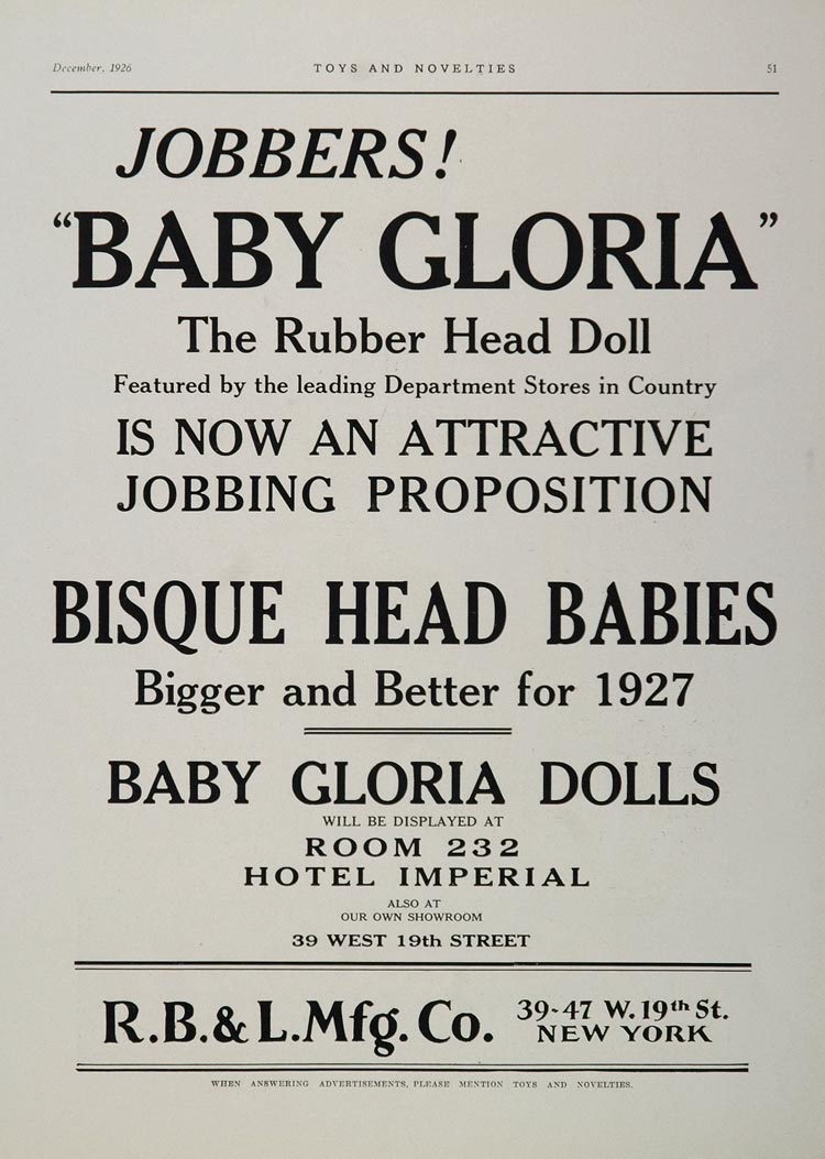 This is an original 1926 two-page, black and white print ad for Baby Gloria Bisque and Rubber Head Dolls from the R. B. & L. Mfg. Co. Please see both images.