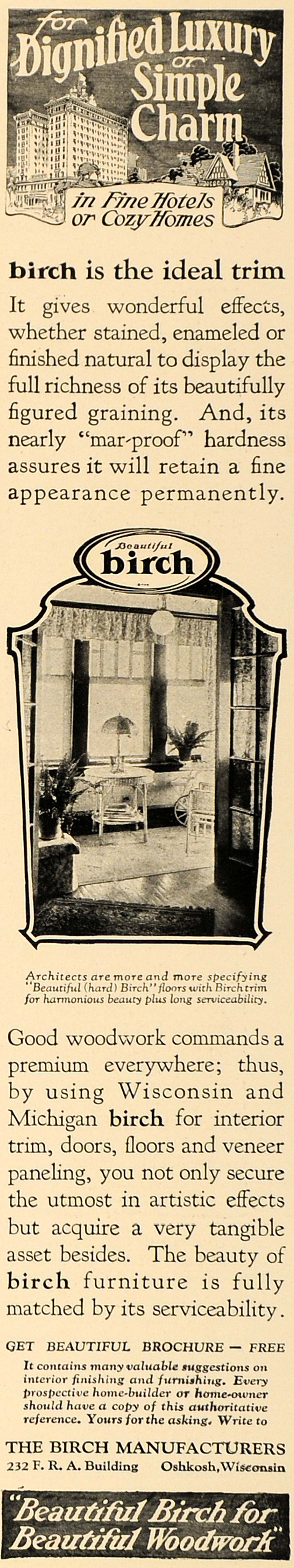This is an original 1926 black and white print ad for birch trim, doors, floors, veneer paneling by The Birch Manufacturers located at 232 F. R. A. Building, Oshkosh, Wisconsin.