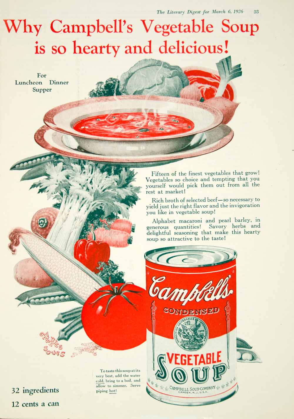 This is an original 1926 two-color print ad for Campbell's Vegetable Soup with 32 ingredients.