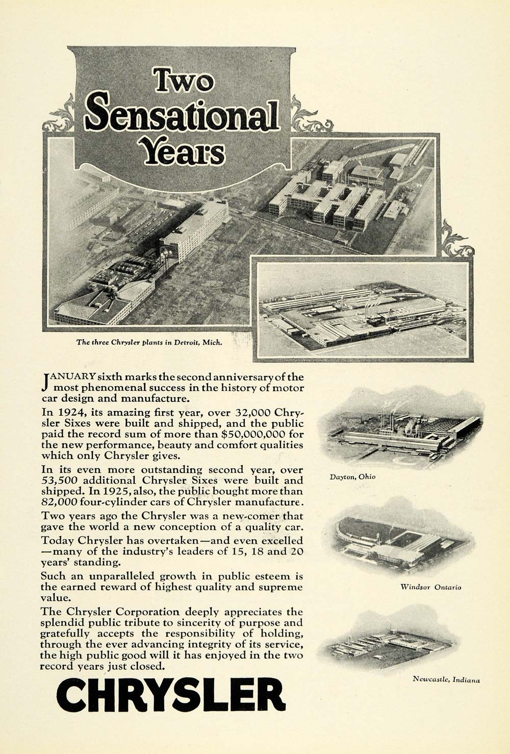 This is an original 1926 black and white print ad for the Chrysler Corporation, today known as the Chrysler Group LLC. This ad features an image of the three Chrysler plants in Detroit, Michigan, a Chrysler plant in Dayton, Ohio, a Chrysler Plant in Windsor, Ontario, and a Chrysler plant in Newcastle, Indiana.