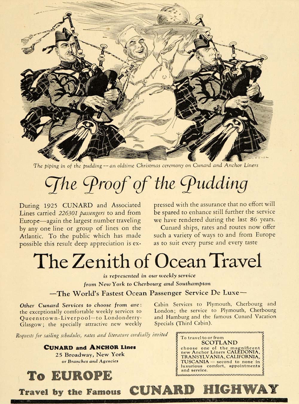 This is an original 1926 black and white print ad for ocean travel on the ships of the Cunard and Anchor Lines. The ad includes a wonderful illustration of the "Piping in of the Pudding"-- an old-time Christmas ceremony on Cunard and Anchor Liners.