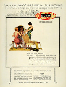 This is an original 1926 color print ad for Du Pont Duco furniture finish, a product line from E. I. du Pont de Nemours & Company. This ad features artwork by Howard Crosby Renwick, also known as Hayden Hayden.