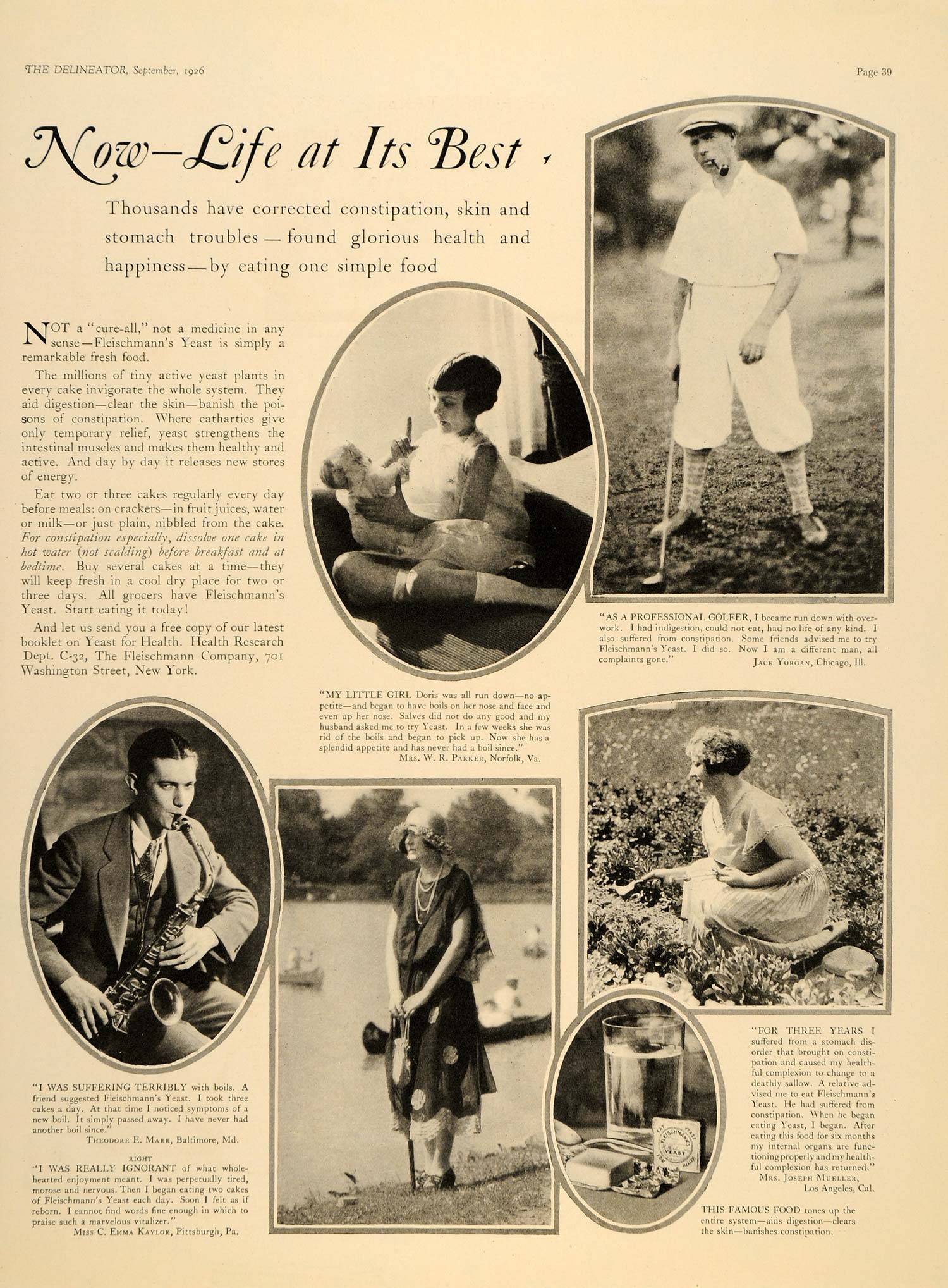 This is an original 1926 black and white print ad for the Fleischmann's yeast from Fleischman Company located at 701 Washington Street, New York. This ad features Mrs. W. R. Parker, Norfolk, Virginia; Jack Yorgan, Chicago, Illinois; Theodore E. Marr, Baltimore, Maryland; Miss C. Emma Kaylor, Pittsburgh, Pennsylvania; Mrs. Joseph Mueller, Los Angeles, California.