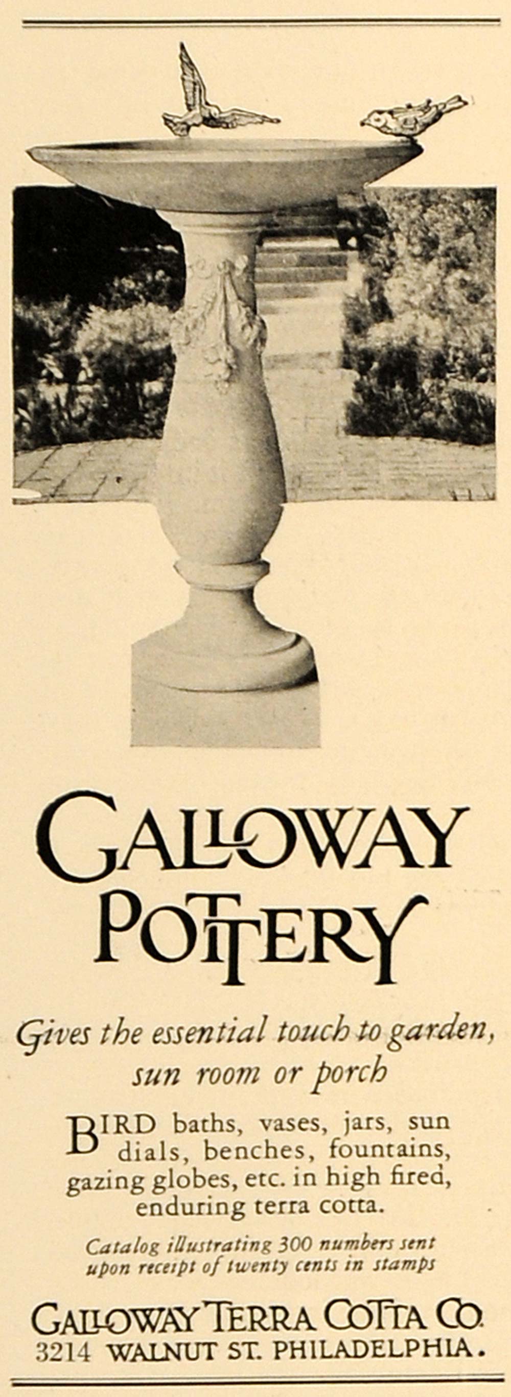This is an original 1926 black and white print ad for a Galloway Pottery bird bath by the Galloway Terra Cotta Company located at 3214 Walnut Street, Philadelphia, Pennsylvania.