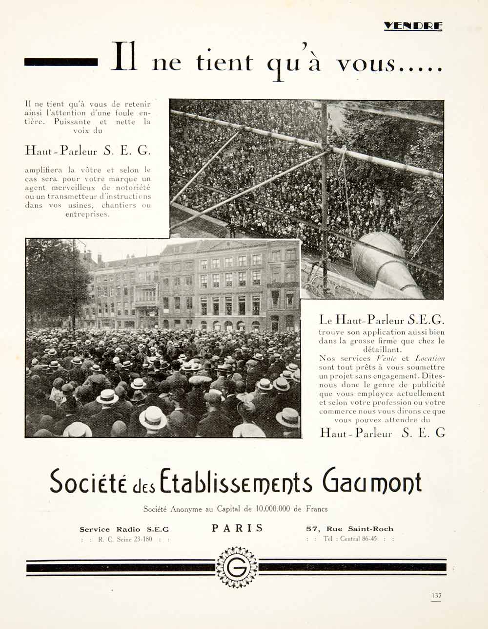 This is an original 1926 black and white print ad for Gaumont loudspeakers, whose offices were located at 57 rue Saint-Roch, Paris.