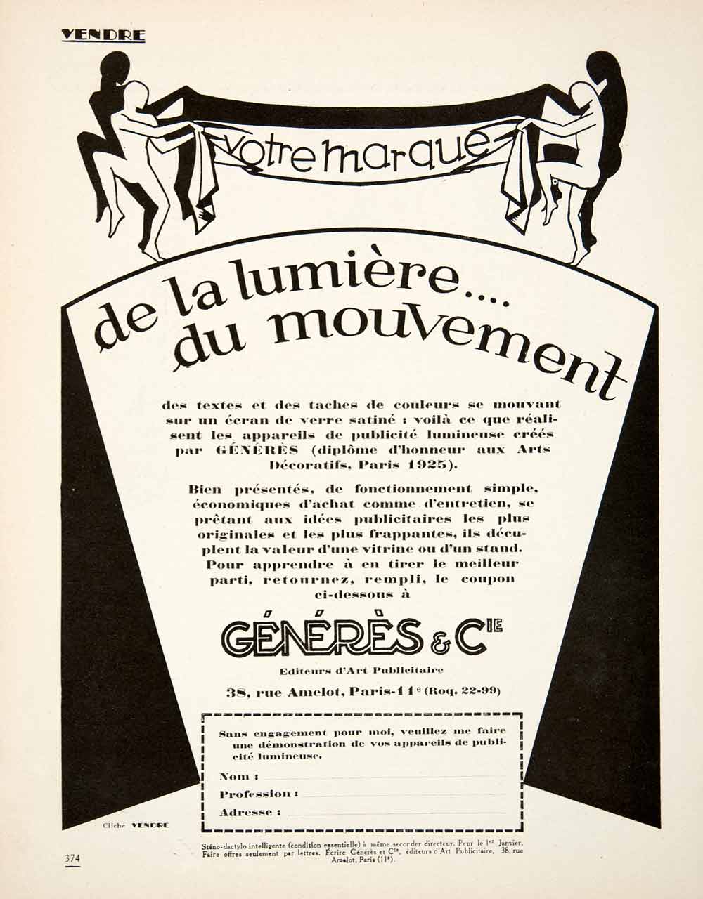 This is an original 1926 black and white print ad for the new illuminated advertisements by Générès & Cie, located at 38 rue Amelot, Paris.