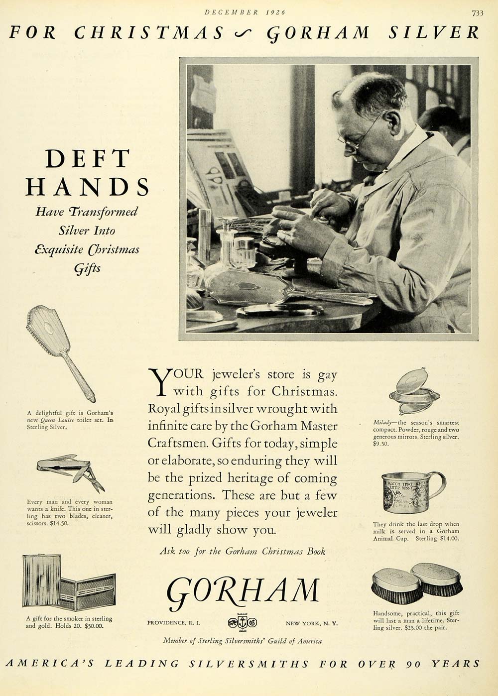 This is an original 1926 black and white print ad for the Gorham products featuring the Gorham's Queen Toilet Set in sterling silver, the Milady compact powder, and the animal cup in sterling silver from Gorham located in Providence, Rhode Island.