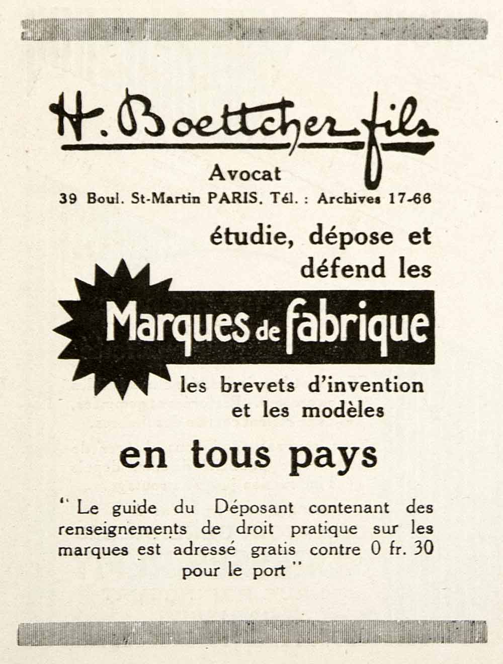 This is an original 1926 black and white print ad for H. Boettcher, fils, a lawyer who specialized in trademark and patent law. His offices were located at 39 Boulevard Saint-Martin, Paris.