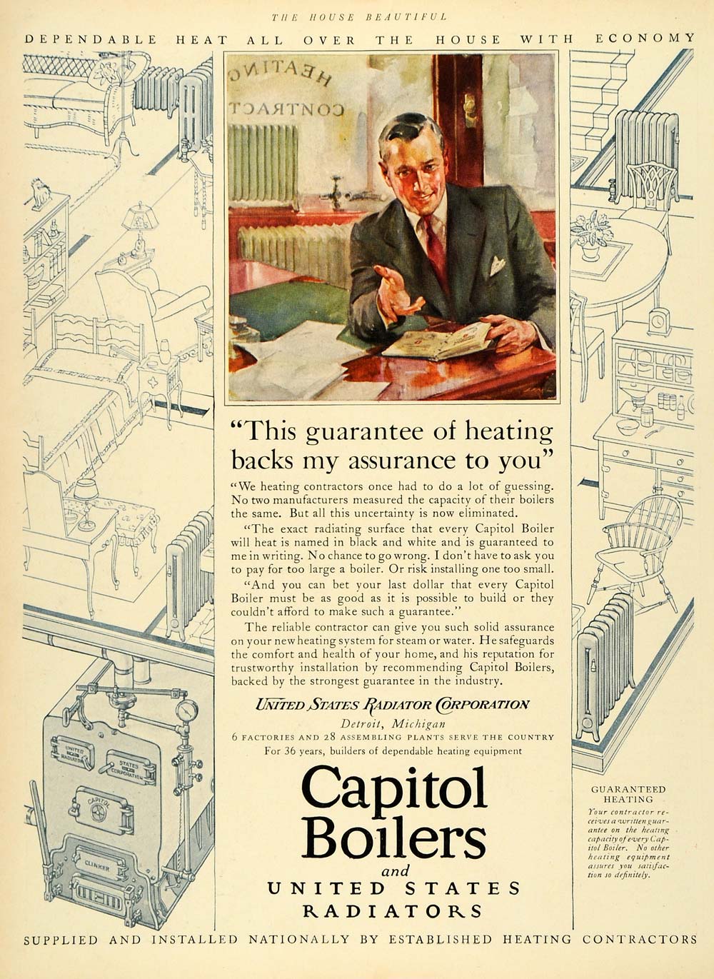 This is an original 1926 color print ad for the Capitol Boilers and United States Radiators from United States Radiator Corporation located in Detroit, Michigan.