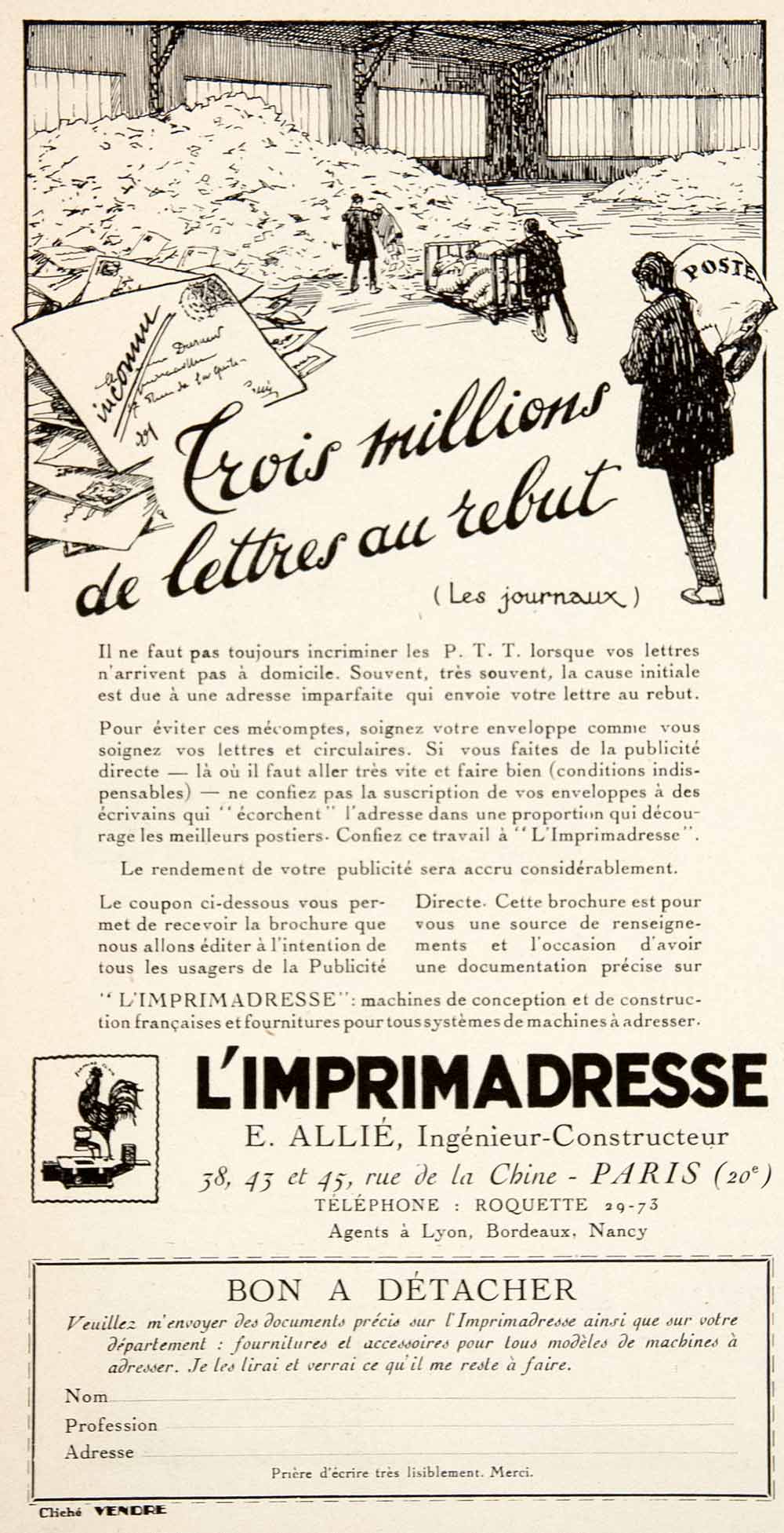 This is an original 1926 black and white print ad for the Imprimadresse, a printing press designed by French engineer Emile Allié, located at 38 rue de la Chine, Paris.