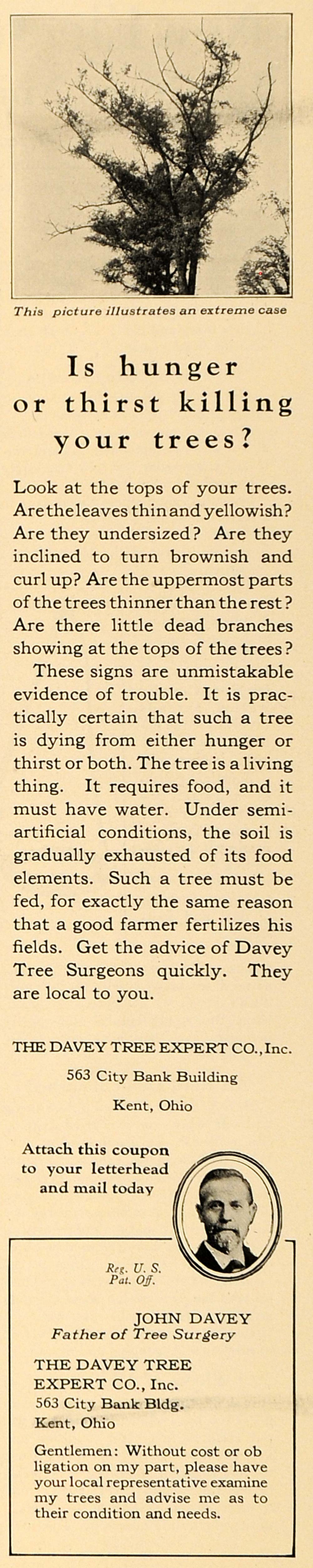 This is an original 1926 black and white print ad for tree surgery by The Davey Tree Expert Company, Inc located at 563 City Bank Building, Kent, Ohio.