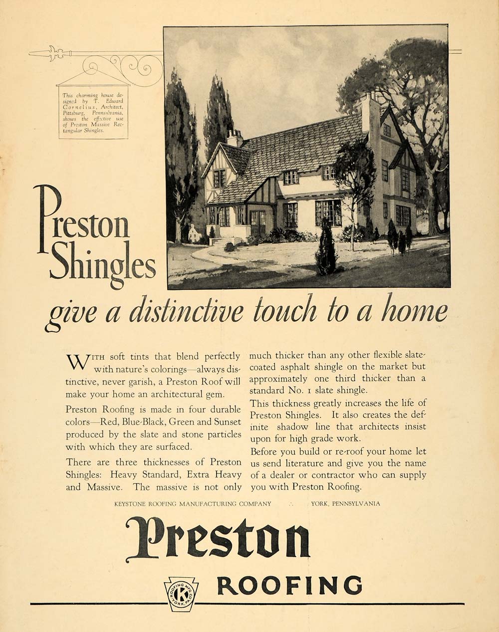 This is an original 1926 color print ad promoting the Preston roof shingles from Keystone Roofing Manufacturing Company located in York, Pennsylvania.