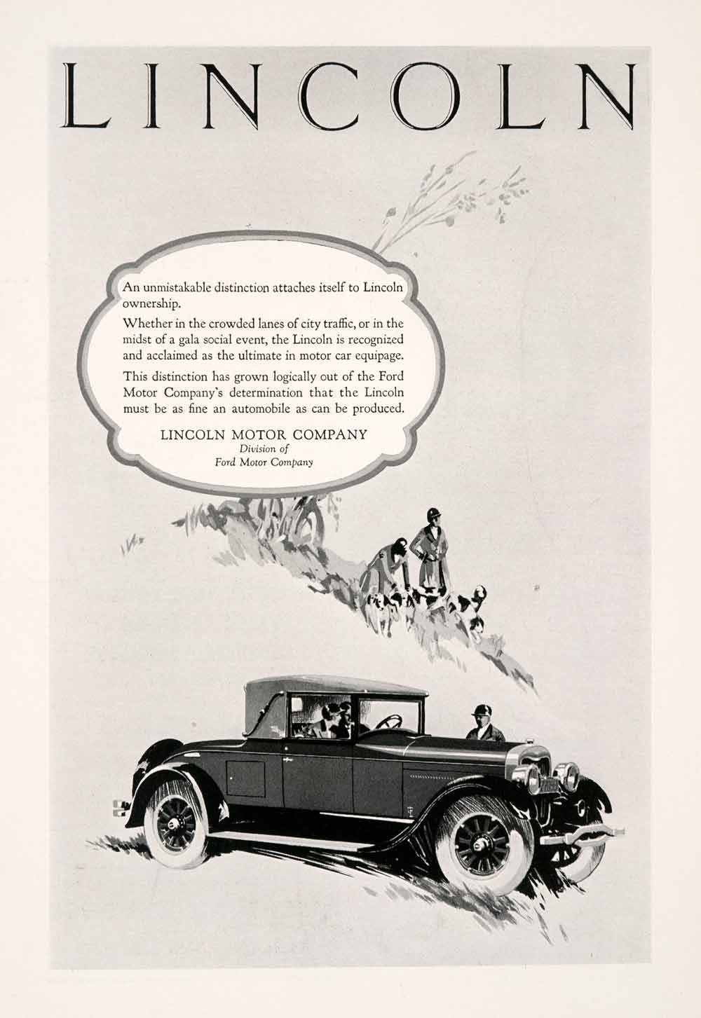 This is an original 1926 black and white print ad for the Lincoln Motor Company, a division of the Ford Motor Company. Seen in the image is what appears to be a group of men fox hunting with their dogs.