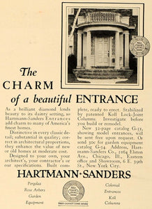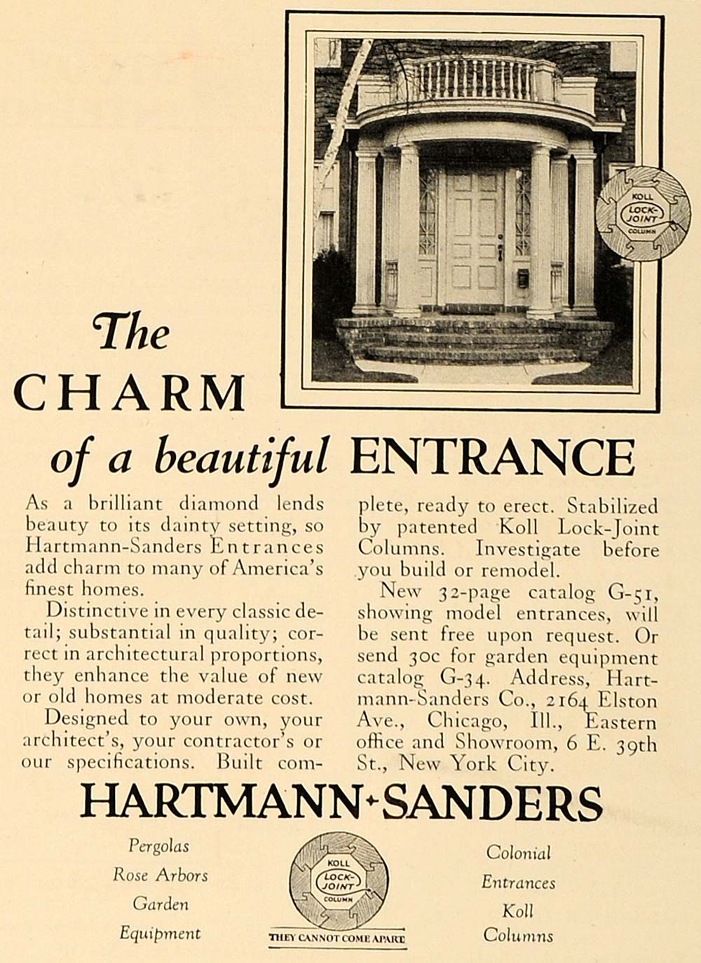 This is an original 1926 black and white print ad for house entrances by Hartmann-Sanders Company located at 2164 Elston Ave, Chicago, Illinois and 6 East 39th Street, New York City, New York.