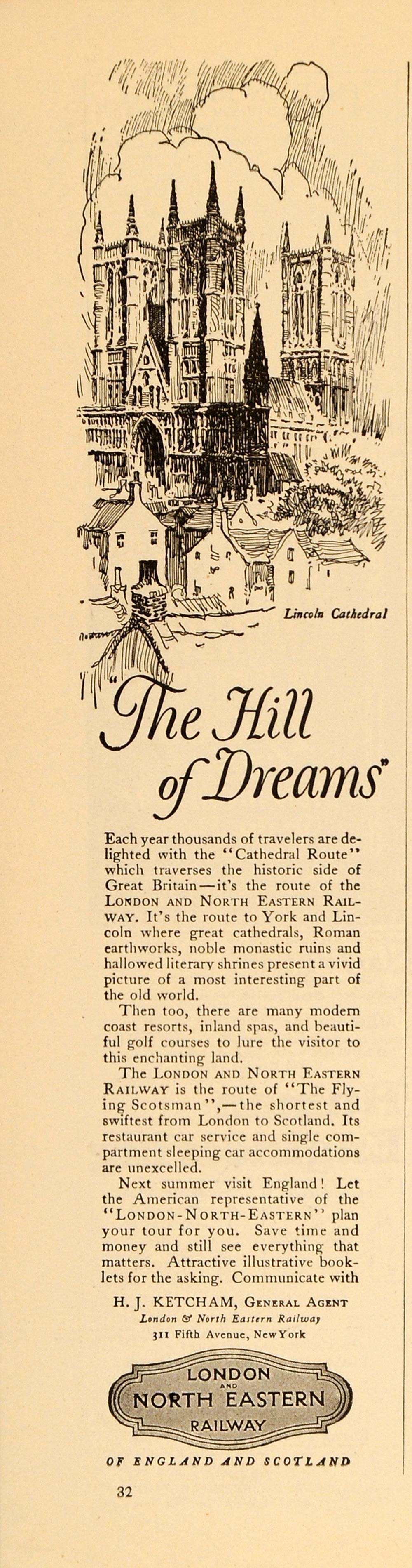 This is an original 1926 black and white print ad for the London and North Eastern Railway (LNER) and their historic "Cathedral Route." The ad includes an illustration of Lincoln Cathedral.