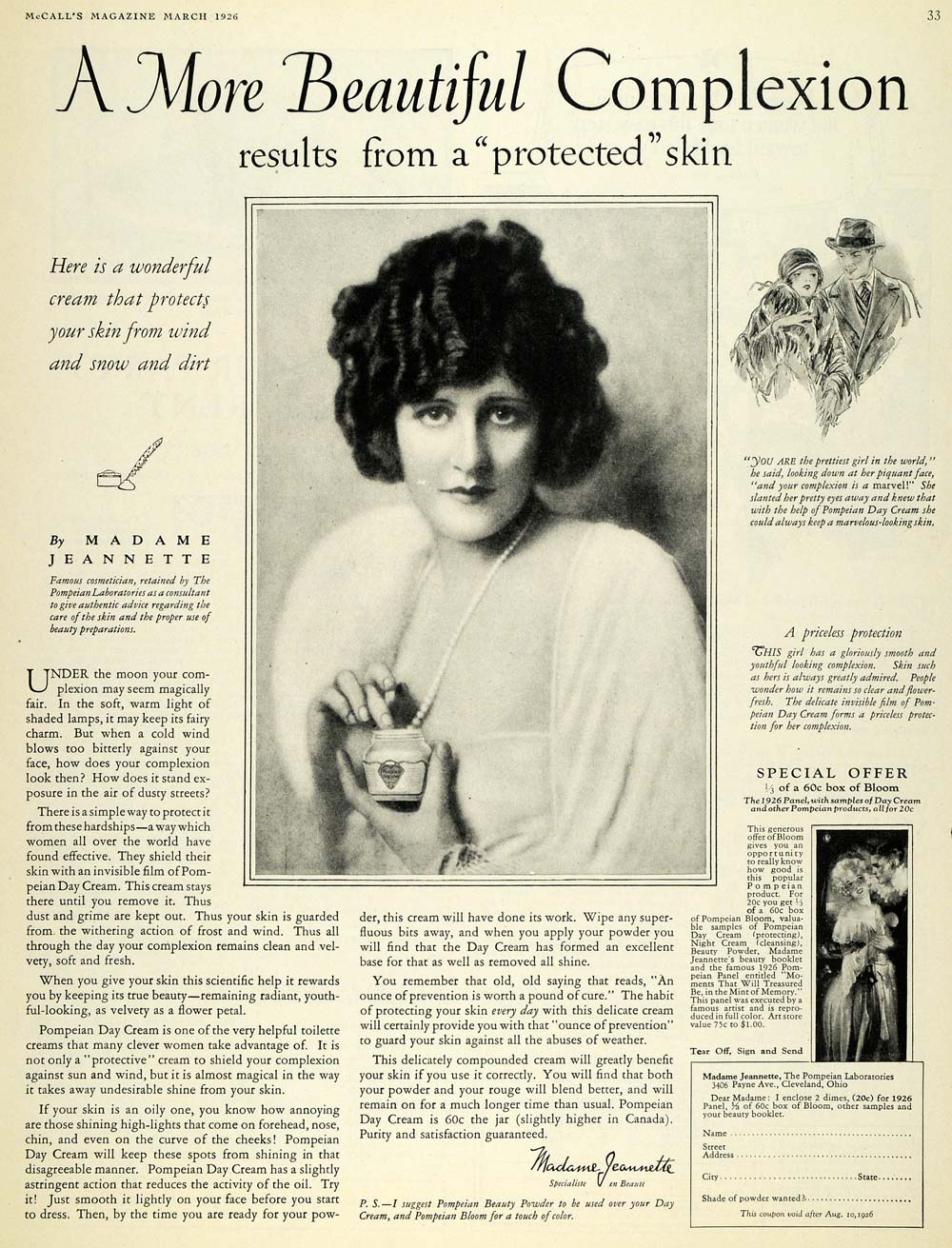 This is an original 1926 black and white print ad for Pompeian beauty creams by Madame Jeannette and The Pompeian Laboratories, located at 3406 Payne Avenue in Cleveland, Ohio.