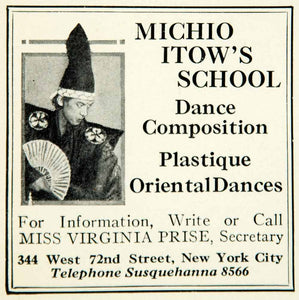 This is an original 1926 black and white print ad for Michio Itow's School of Dance Composition and Plastique Oriental Dances.