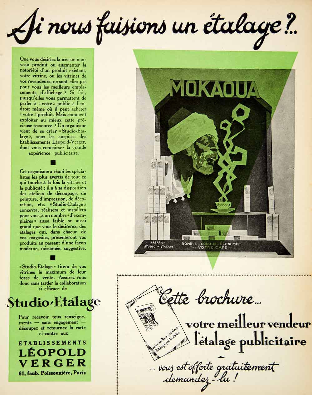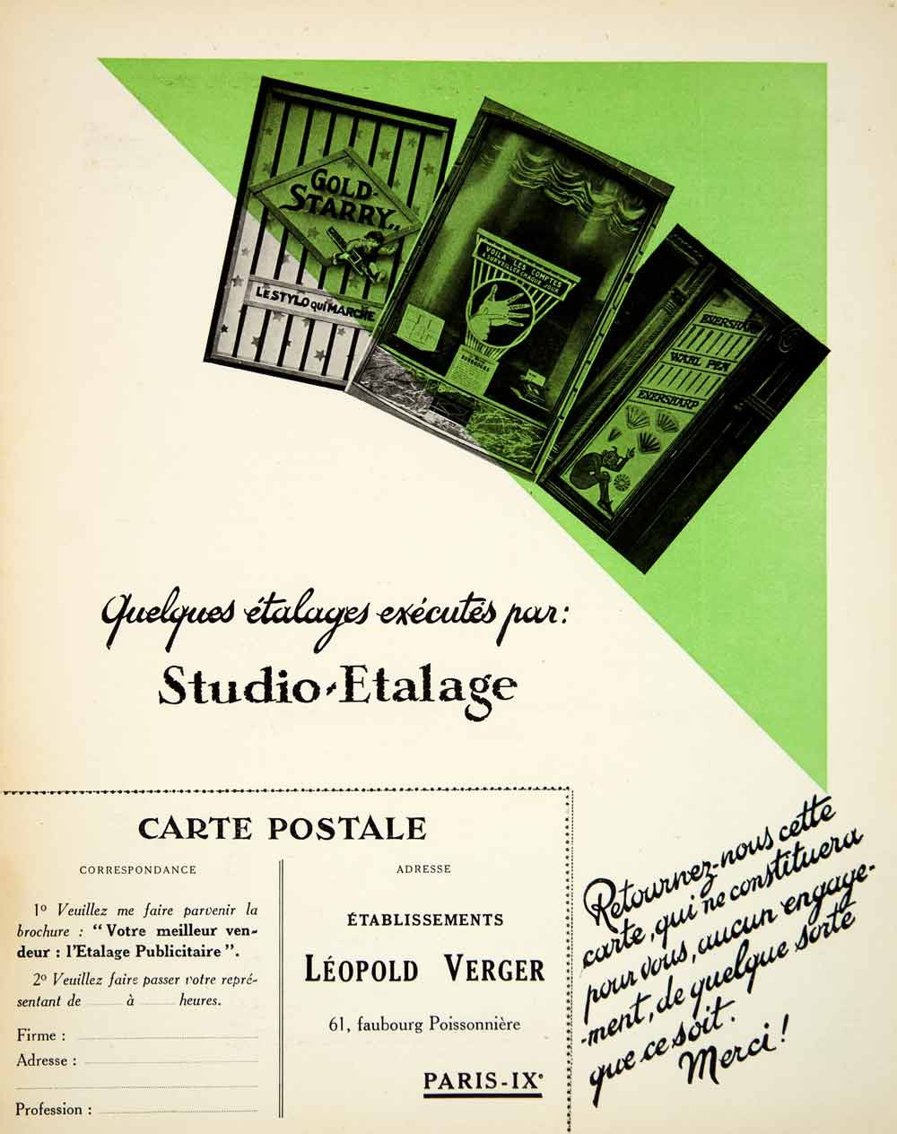 This is an original 1926 two-page two-color print ad (one double-sided page) for the charming advertising displays of Léopold Verger, whose establishments were located at 61 faubourg Poissonnière, Paris. The perforated postcard could be mailed in for more information. Please be sure to view the additional image.