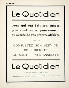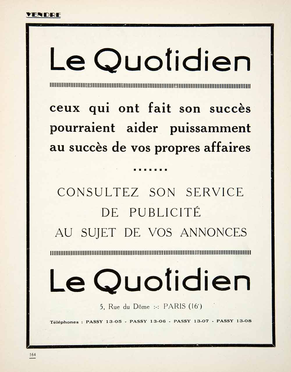This is an original 1926 black and white print ad for the professional advertising advisors at Le Quotidien, whose offices were located at 5 rue du Dôme, Paris.