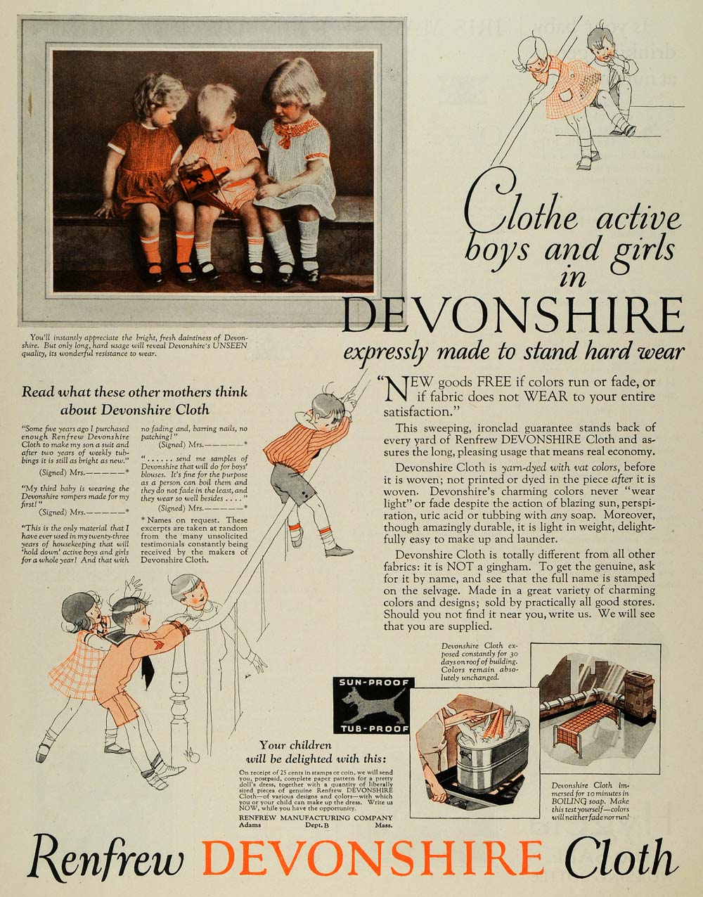 This is an original 1926 color print ad for Renfrew Devonshire Cloth used to make clothing for active boys and girls, by Renfrew Manufacturing Company of Adams, Massachusetts.