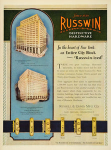 This is an original 1926 color print ad for Russwin Distinctive Hardware by the Russell and Erwin Manufacturing Company of New Britain, Connecticut. This ad features an image of the No. 1 Park Avenue Building in New York with architecture by York and Sawyer and contractors the Henry Mandel Building Company, Inc. The ad also shows an image of the New York Furniture Exchange Building with architecture by Buchman and Kahn and contractors G. Richard Davis and Company, Inc.