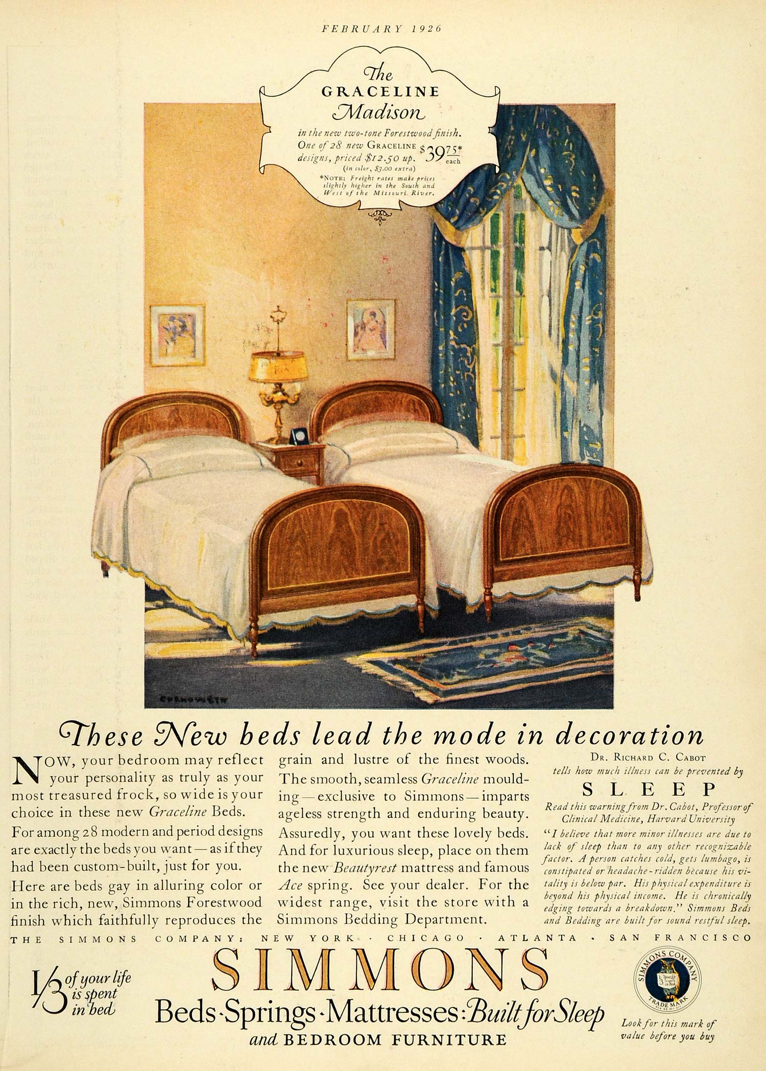 This is an original 1926 color print ad for Simmons mattresses from the Simmons Company. The advertisement features a quote by Dr. Richard C. Cabot.