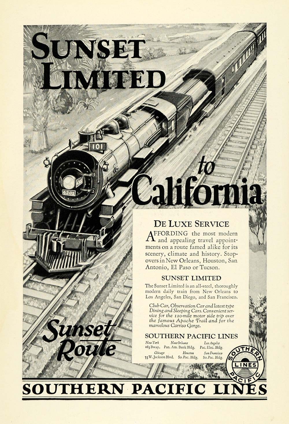 This is an original 1926 black and white print ad for the Sunset Limited promoting travel to California from Southern Pacific Lines.