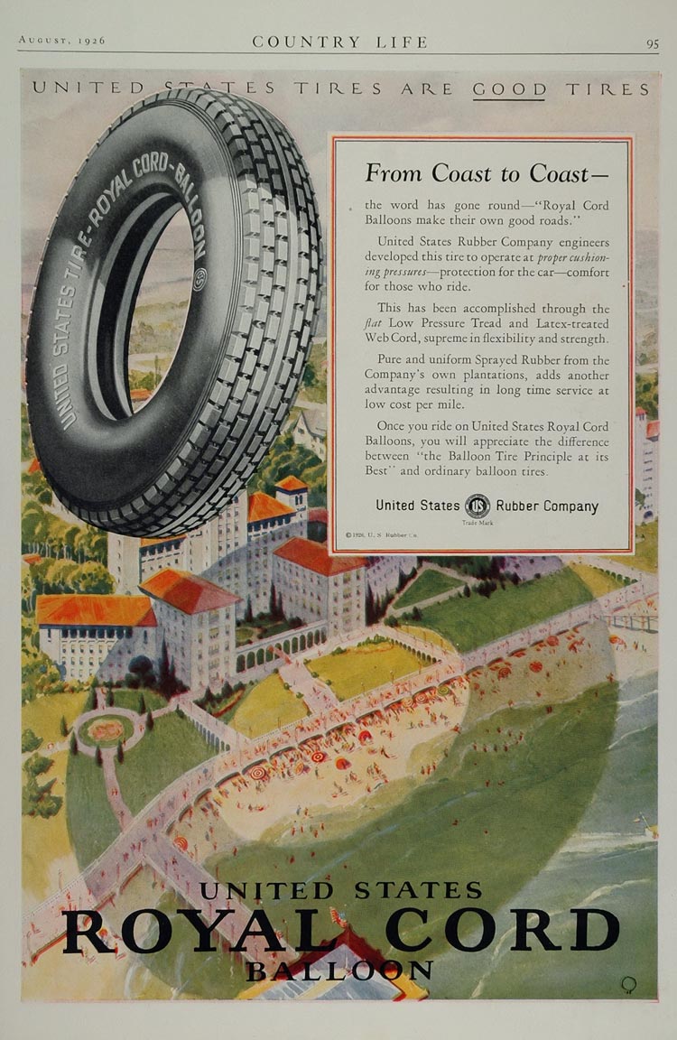 This is an original 1926 color print ad for U. S. Royal Cord Balloon Automobile Tires from the United States Rubber Company. The ad has a great illustration of the famous Breakers Hotel and beach front in Palm Beach, Florida.