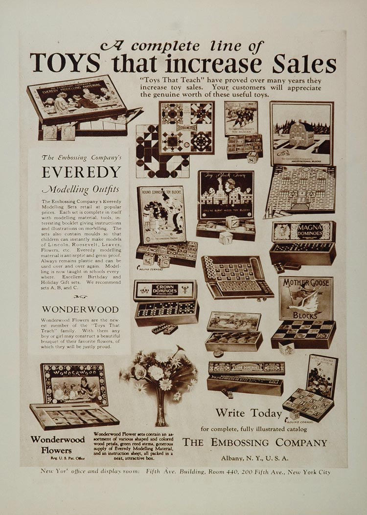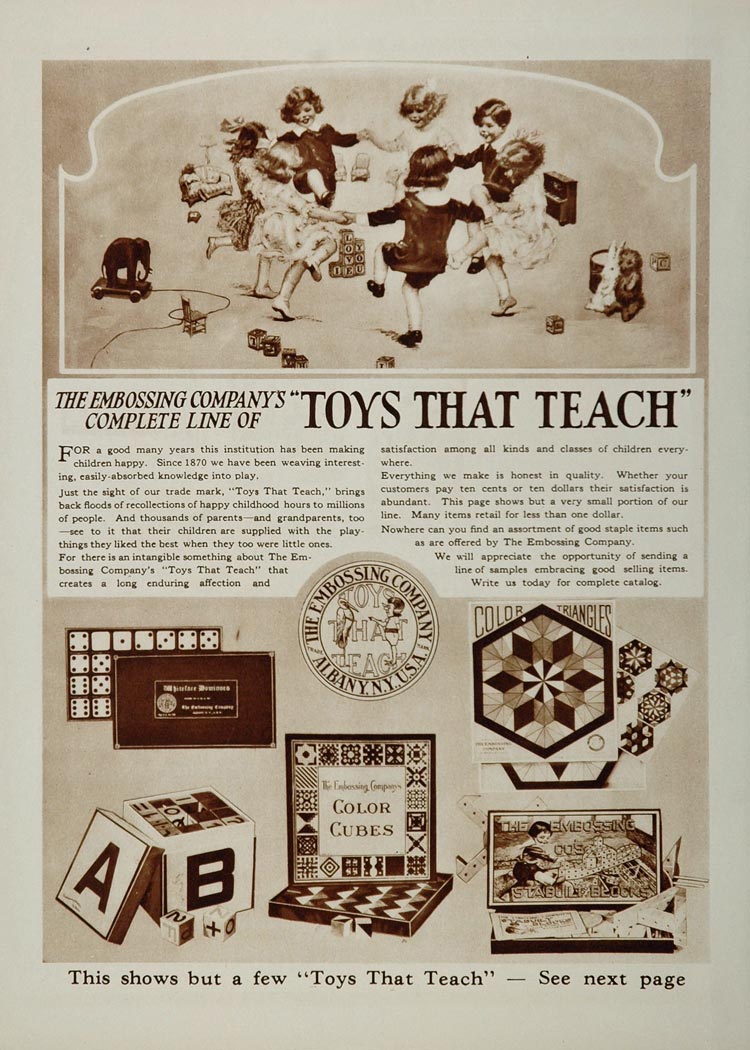 This is an original 1926 double-sided print ad for educational toys-- "Toys That Teach" including wood blocks, dominoes, and the new Wonderwood Flowers set that allows "any boy or girl to construct a beautiful bouquet of their favorite flowers, of which they will be justly proud" from The Embossing Company of Albany, New York. The ad includes a great illustration of children dancing. Please see both images.