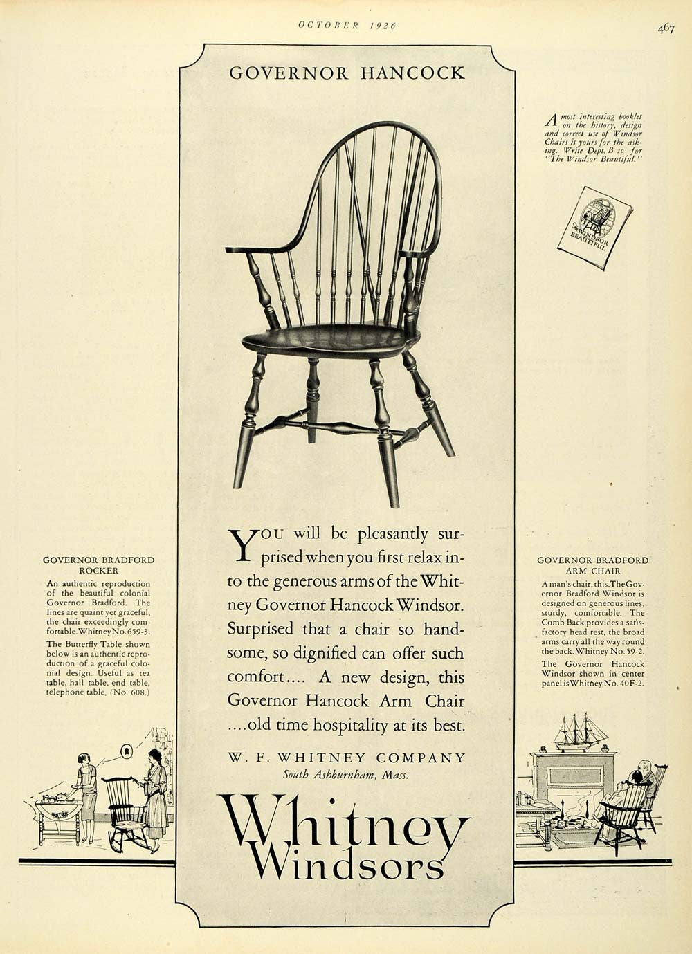 This is an original 1926 black and white print ad for the Whitney Windsors Furniture promoting the Whitney Governor Hancock Windsor Chair, the Governor Bradford Rocker No. 659-3, and the Butterfly No. 608 from W. F. Whitney Company located in Massachusetts.