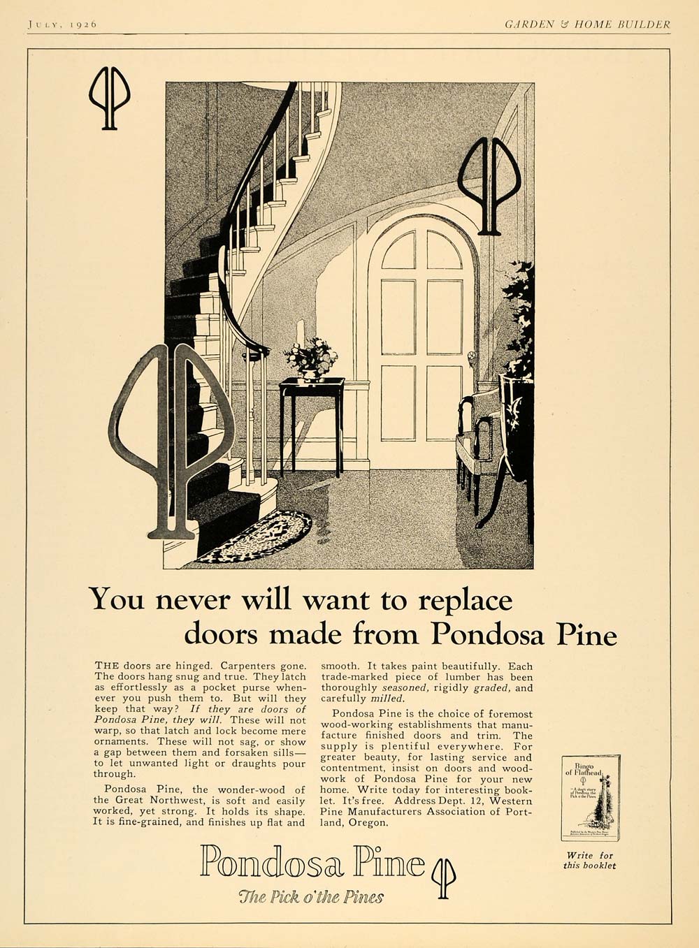This is an original 1926 black and white print ad promoting the Pondosa Pine products from Western Pine Manufacturers Association located in Portland, Oregon.
