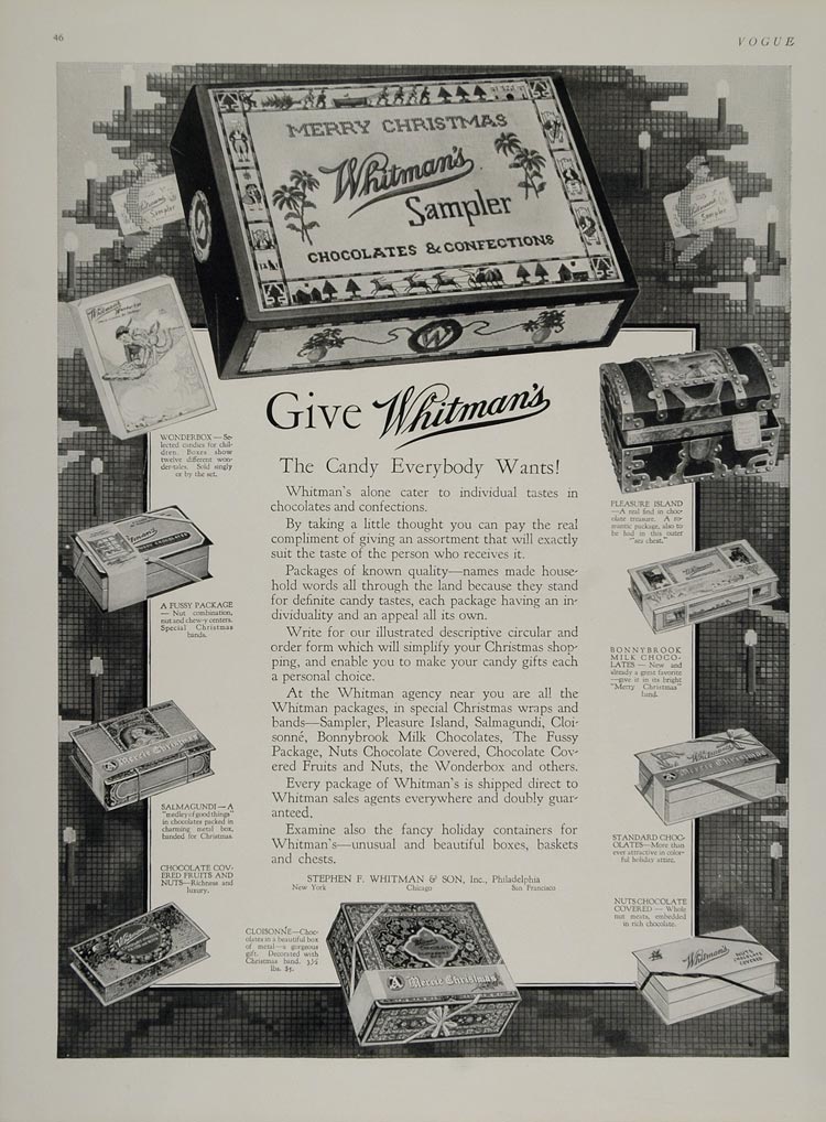 This is an original 1926 black and white print ad for Whitman's Chocolates for Christmas. The Whitman boxes illustrated here include the Whitman's Sampler Box; the Wonderbox; a Fussy Package; the Salmagundi; Chocolate Covered Fruits and Nuts; the CloisonnŽ Box; Nuts Chocolate Covered; Standard Chocolates; Bonnybrook Milk Chocolates; and the Treasure Island Chest. An ideal (and calorie-free) gift for the chocoholic in your family!