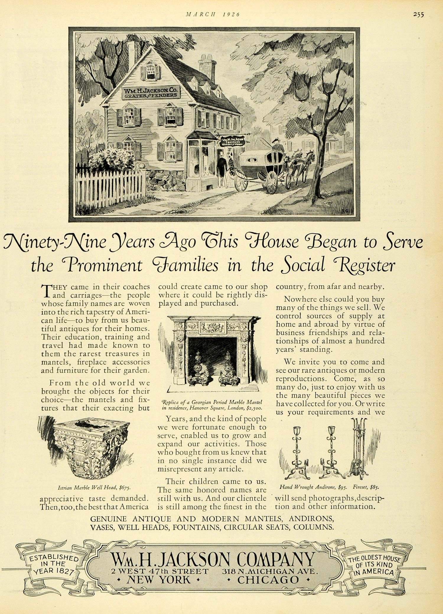 This is an original 1926 black and white print ad for the William H. Jackson Company of New York, and Chicago. Shown in the advertisement is the William H. Jackson Company house, a marble well head, a marble mantel and a hand wrought fire set.