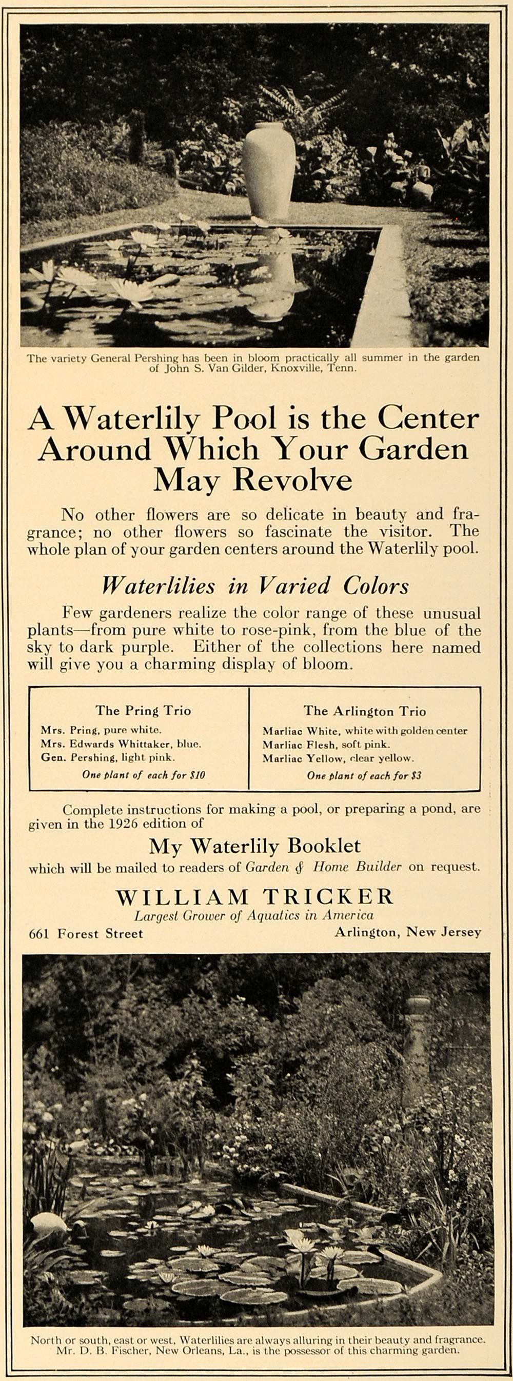 This is an original 1926 black and white print ad for waterlilies by William Tricker, largest grower of aquatics in America, located at 661 Forest Street, Arlington, New Jersey. This ad shows the gardens of John. S. Van Gilder of Knoxville, Tennessee and Mr. D. B. Fischer of New Orleans.