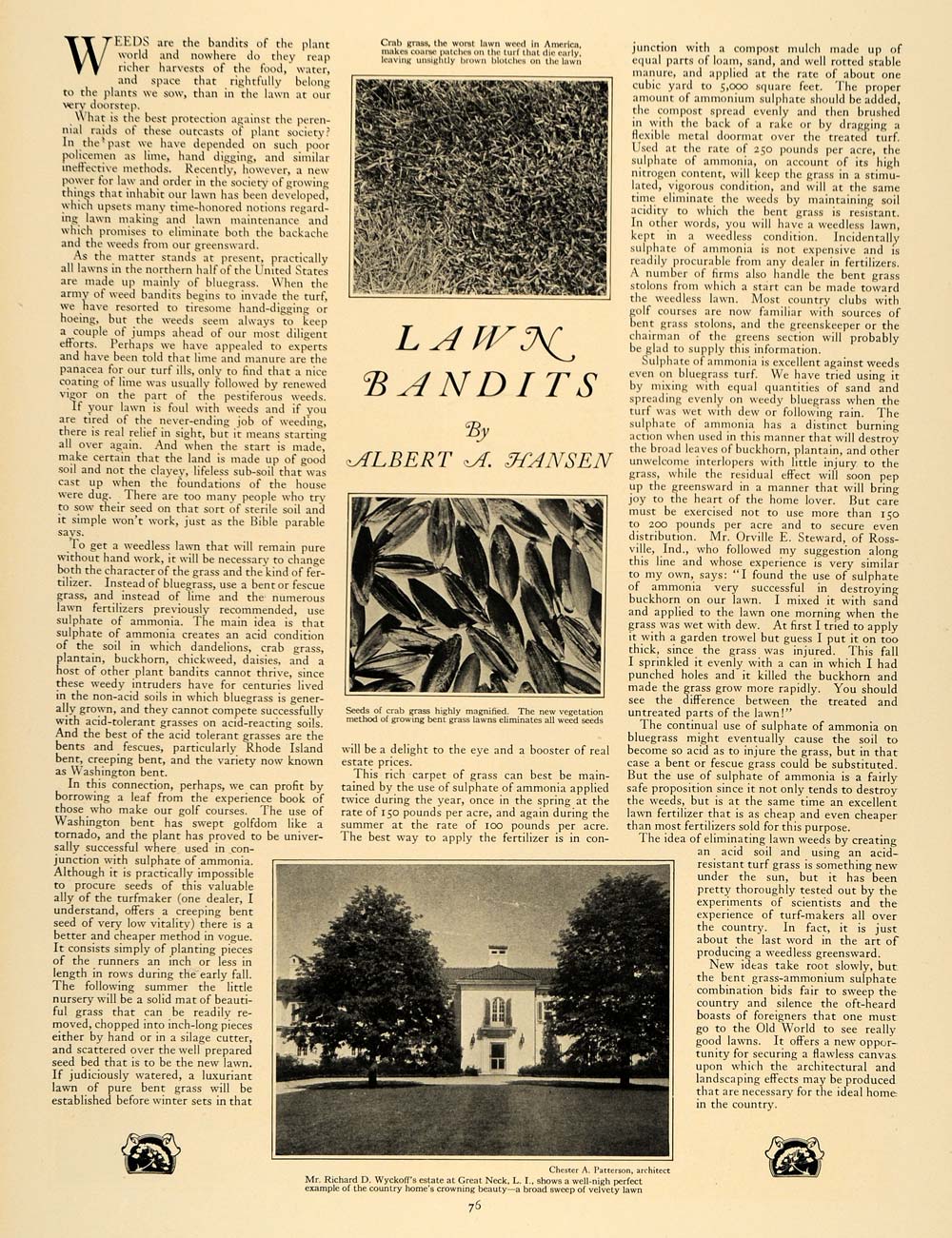 This is an original 1926 1 page article by Albert A. Hansen on crab grass and other pesky lawn weeds. This article features an image of Mr. Richard D. Wyckoff's estate in Great Neck, Long Island, with architecture by Chester A. Patterson.