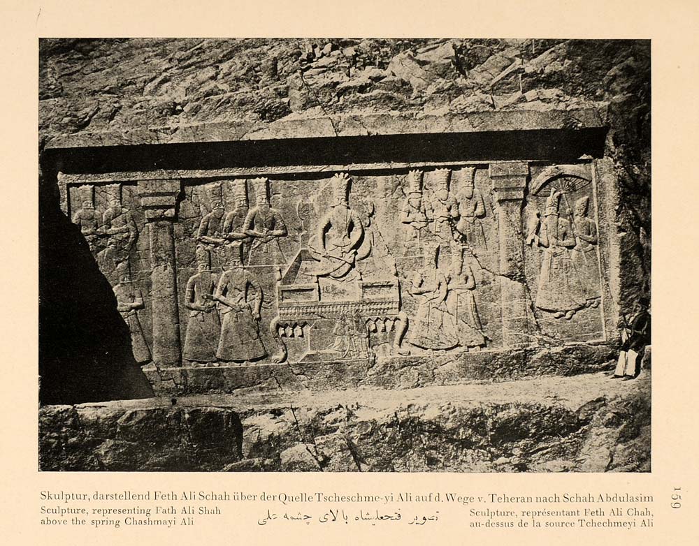 This is an original 1926 halftone print of a sculpture above the spring Chashmayi Ali representing Fat_h Ali Shah Qajar who ruled Persia from 1797 to 1834. (Please note that, typical of halftone prints, there is printing on the reverse.)