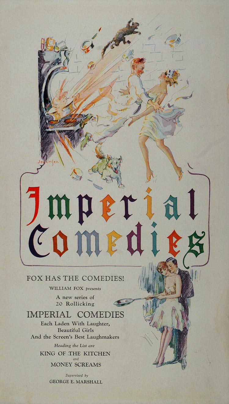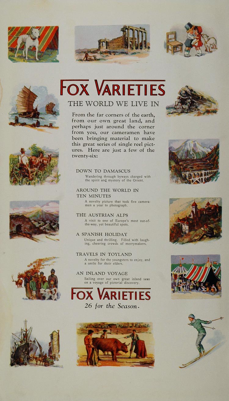 Truly scarce, if not one of a kind! The first image is the flyer for The Fox Imperial Comedies, presented by William Fox and supervised by George E. Marshall, illustrated by Jockinsen with signature in print. This series of 20 comedies includes "King of the Kitchen" and "Money Screams." On the reverse, and pictured below, is the promotional flyer for the 26 Fox Varieties about "the world we live in" with shorts like "The Austrian Alps," "Down to Damascas," and "Travels in Toyland."