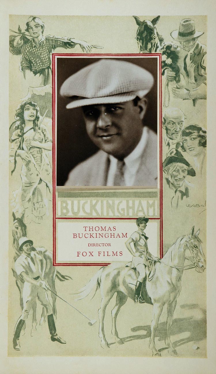 Thomas Buckingham (1895-1934), director, writer, cinematographer. Some of his many films include: Should Tailors Trifle? (1920), One Horse Town (1922), Two of a Kind (1922), Off His Beat (1922), Easy Payments (1926), His Own Lawyer (1926), The Two Johns (1926), and Crashing Through (1928).