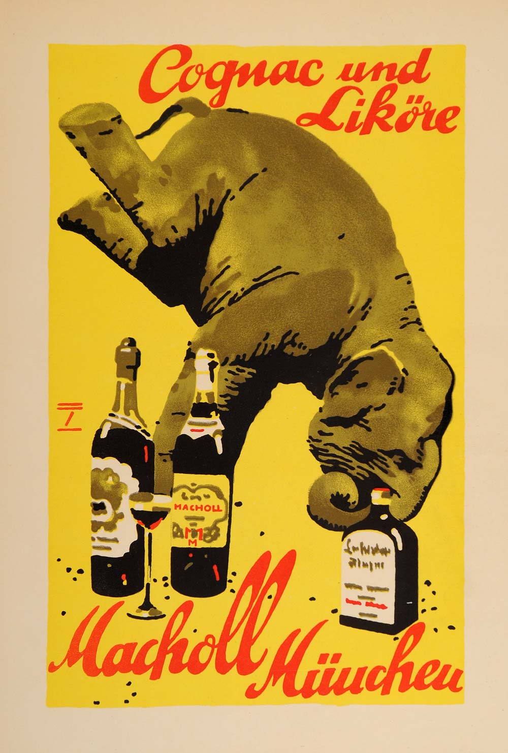 This is an original 1926 five-color lithograph advertising mini poster by Ludwig Hohlwein for Macholl Cognac and Liquors.