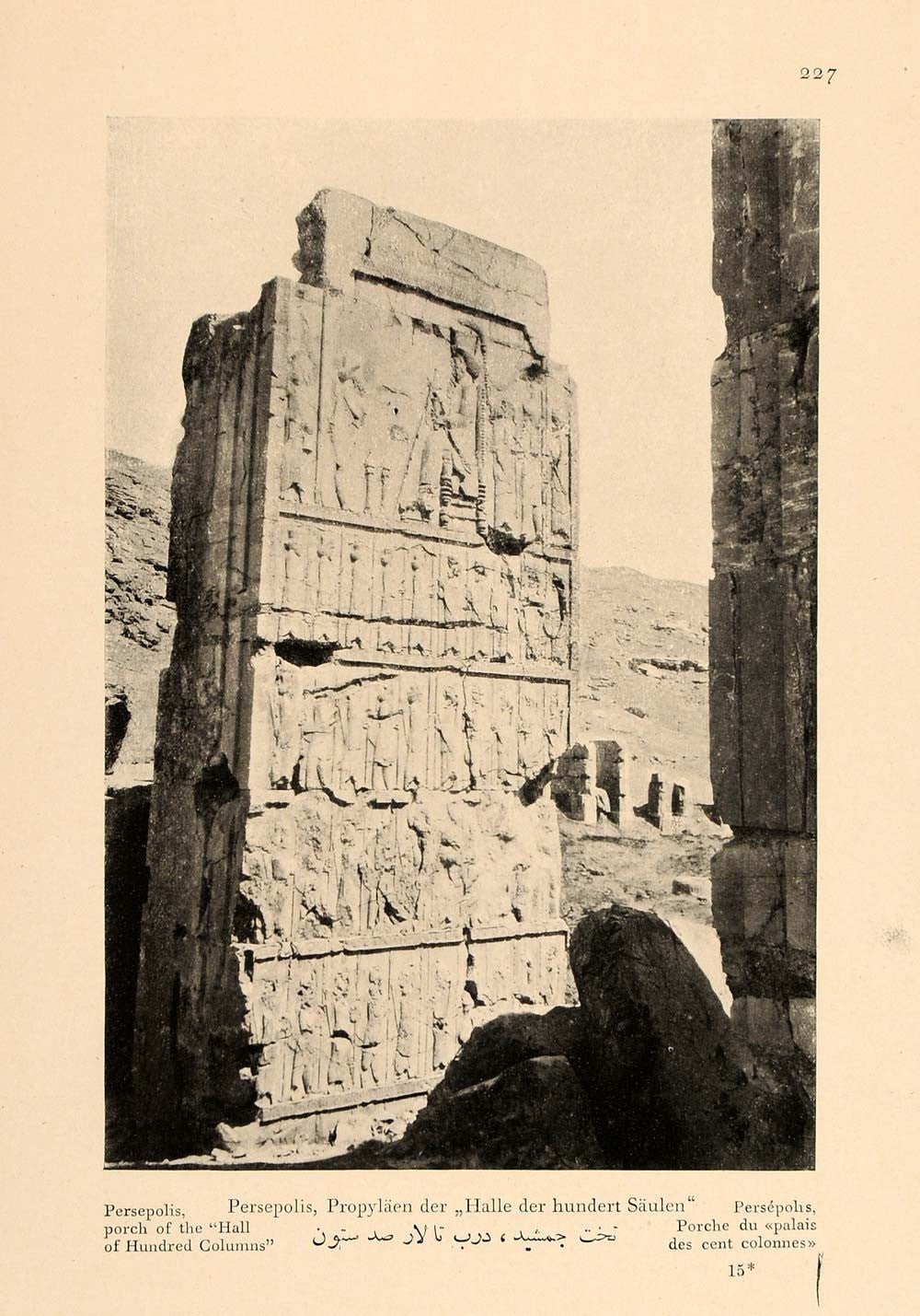 This is an original 1926 halftone print of the archaeological ruins of the Hall of a Hundred Columns in Persepolis, Iran (Persia) dating from the Achaemenid Persian Empire. (Please note that, typical of halftone prints, there is printing on the reverse.)