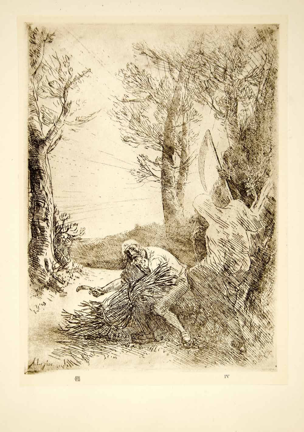 This is an original 1926 tipped-in black and white photogravure of an etching by the French painter, sculptor, and etcher, Alphonse Legros (1837-1911) of an illustration of a fable by Jean de La Fontaine.